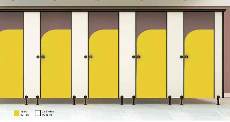 All doors will be of single colour and made of 12 mm thick HPL compact panel. Each door will be supported by 3 stainless steel made hinges affixed to the pilasters. Nylon made coat hook and door knob are provided with each door.