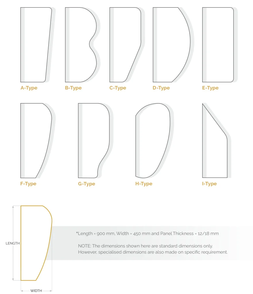 To cater to varied architectural needs and design aesthetics, UPPs are available in nine distinctive shapes: A-Type through I-Type, each offering a unique silhouette that enhances both visual appeal and functional separation. With standard dimensions of 900 mm in length, 450 mm in width, and a panel thickness of 12/18 mm, these panels can also be customised to fit specific project requirements. Whether your priority is enhanced privacy, seamless integration, or a stylish upgrade, CubiQ’s Urinal Privacy Panels offer a reliable and sophisticated restroom solution.